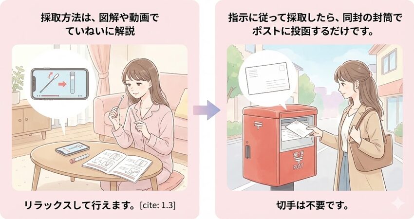 検査の精度を保つためにも、自宅など清潔で落ち着ける場所で採取することをおすすめします。」