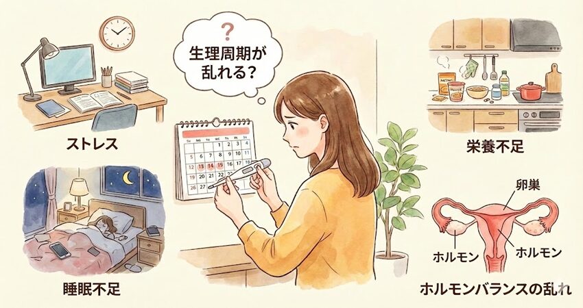 ストレスは自律神経やホルモンのリズムに影響しやすく、周期がずれるきっかけになることがあります。